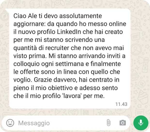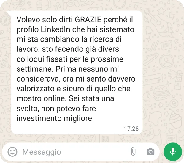 Sì, creiamo profili LinkedIn da zero per chi parte senza alcuna esperienza sulla piattaforma. Se invece hai già un profilo, lo ottimizziamo completamente: testi, sezioni, parole chiave, immagine professionale e posizionamento strategico.